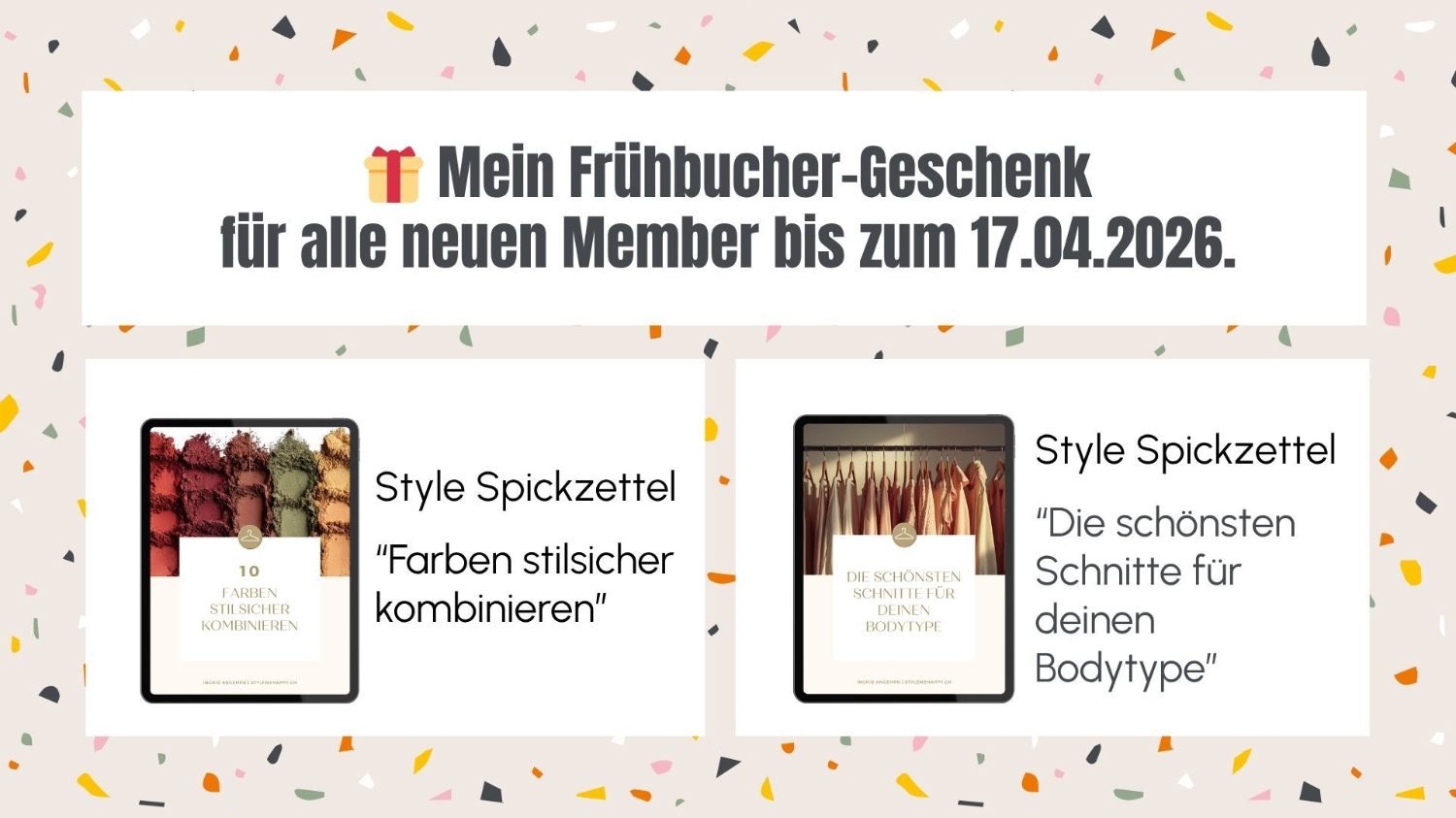 Jeden Monat stelle ich dir ein neues Video vor, das deine Stilentwicklung unterstützt. Beispielthemen: Französicher Stil, Natürlicher Stil, Farben kombinieren, Schuhe & Outfit kombinieren, Shoppingtipps, Trendanalysen, was für welchen Bodytype,.. Auch Neumitglieder haben Zugang zu allen vergangenen Videos.
